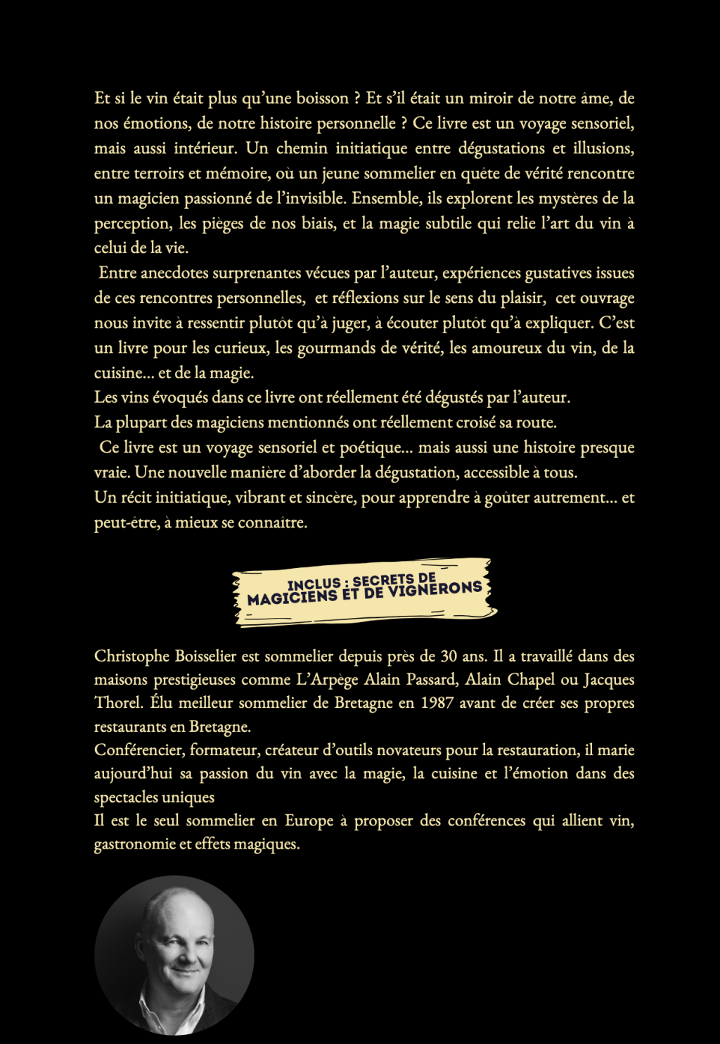 Et si le vin était plus qu’une boisson ? Et s’il était un miroir de notre âme, de nos émotions, de notre histoire personnelle ? Dans ce guide du vin pas comme les autres, mêlant œnologie et magie, vous partirez pour un voyage sensoriel… et intérieur. Entre terroirs et mémoire, un jeune sommelier en quête de vérité rencontre un magicien passionné de goût : leur odyssée devient une véritable initiation à la dégustation de vin et aux illusions de la perception.