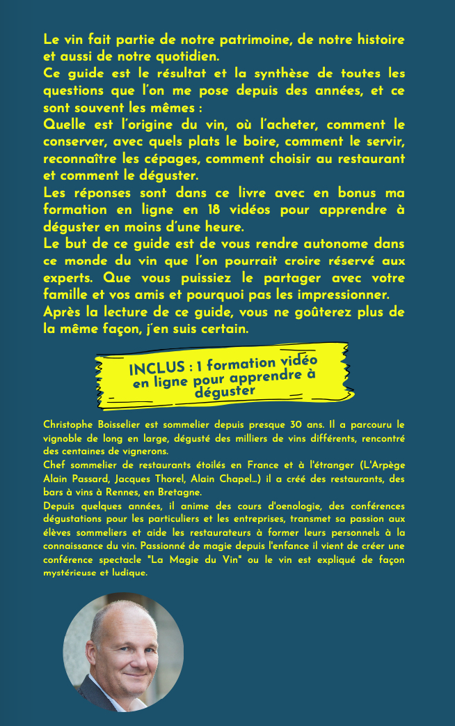 Bonjour, je commence à m’intéresser au Vins et je suis tombé sur votre livre. Il est magnifique, incroyable, plein d’expérience, d’anecdotes et de connaissances. J’ai trouvé ce livre parfait, un des meilleurs sur le Vins que j’ai pu lire. De plus, à la fin, l’auteur vous propose une formation qui est payante, mais grâce a ce livre, vous avez une réduction, vous ne payez rien pour cette formation. Ce livre reflète bien ce que représente le vin pour moi, le partage et de belles valeurs.